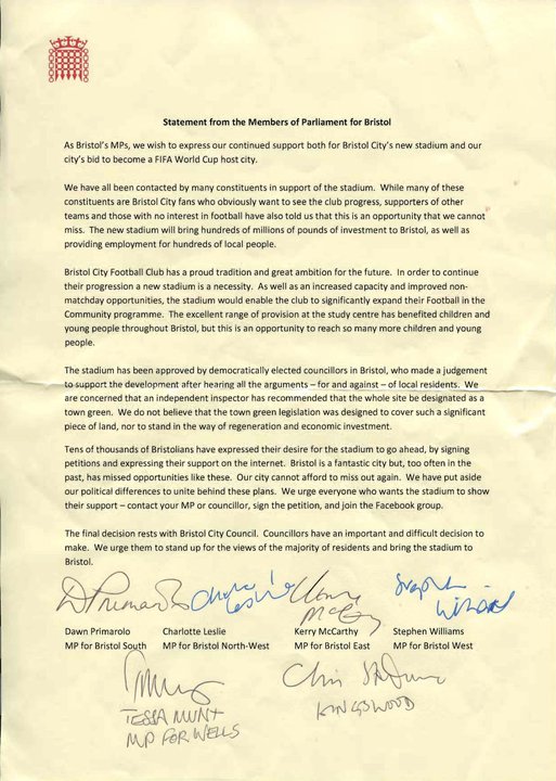 Doesn't really tell us anything new, then - we're left with a final para in the MPs statement that calls for the councillors to put 'the views of the majority of residents' ahead of anything else. Except, of course, that "The letter was not intended as an incitement to break the law, merely a way of highlighting the support that there is in Bristol for this development, which is not what the joint statement said, and was hardly necessary in any case given the combined efforts of club, council, and BEP.